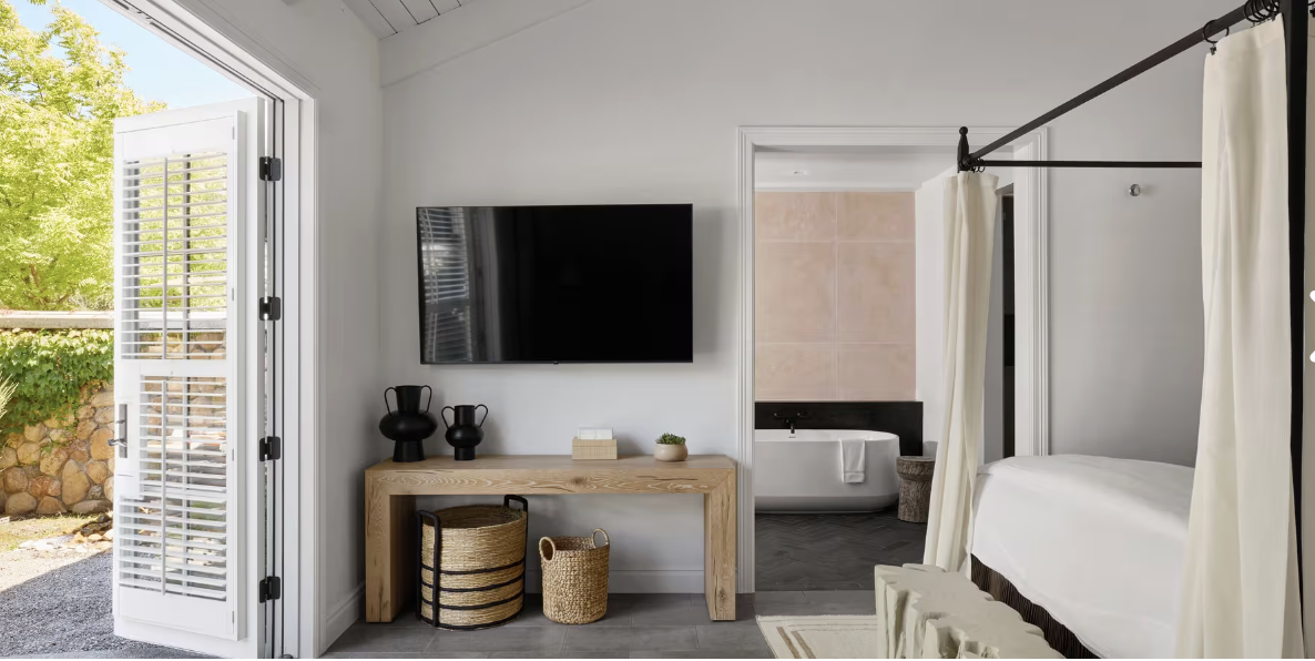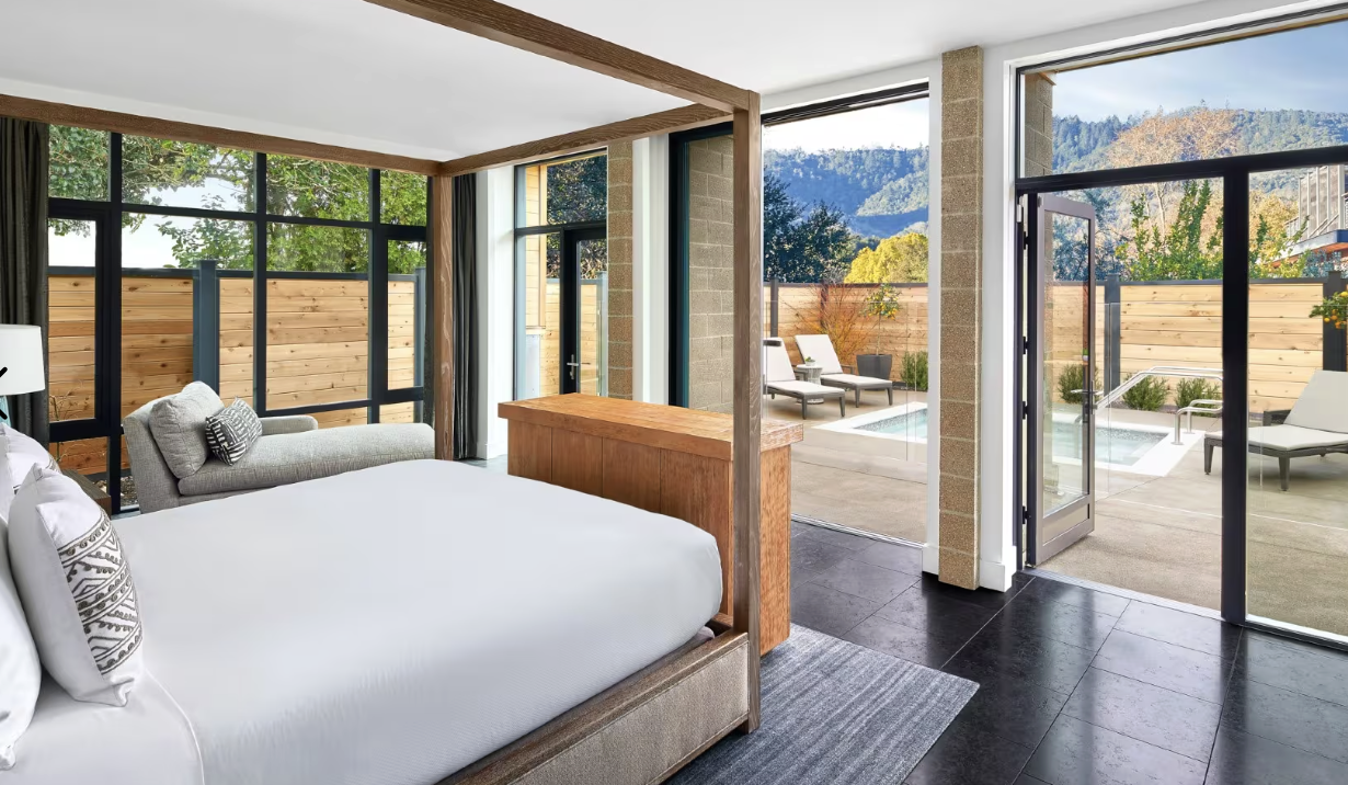 Rustic-luxe suites with fireplaces and soaking tubs—walkable to Bouchon and all Yountville wine tasting.